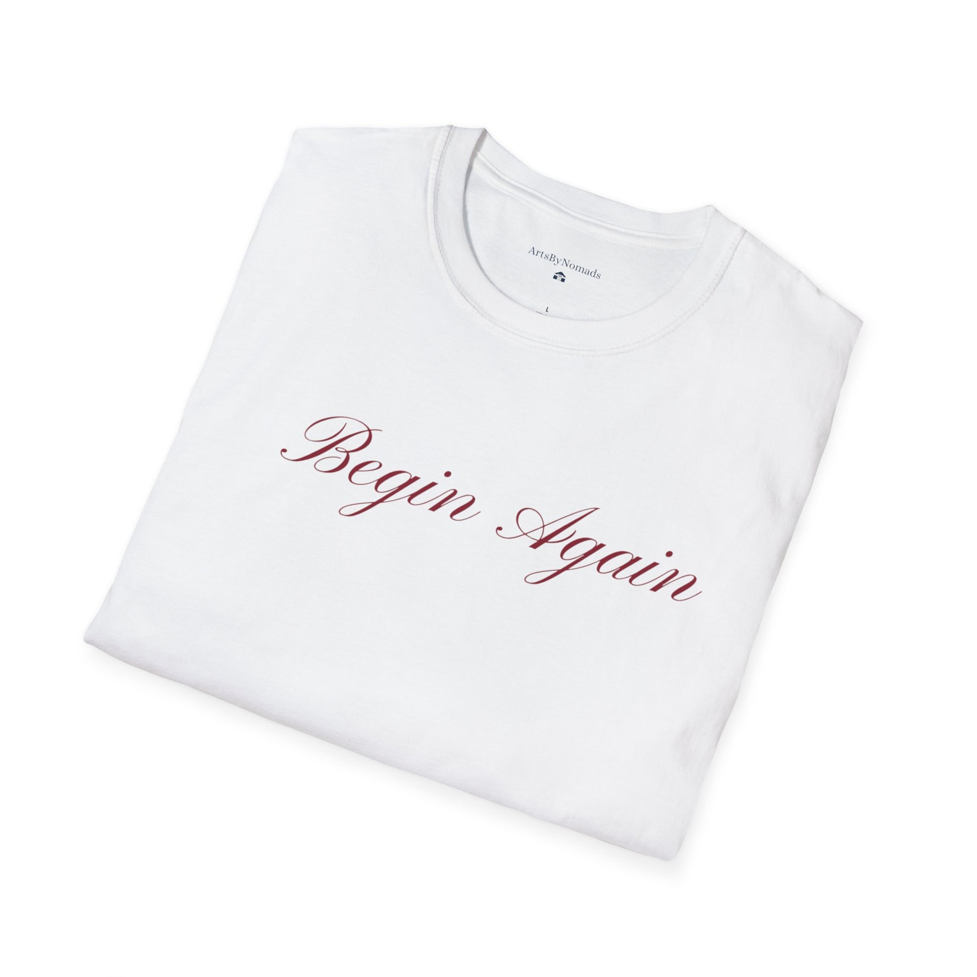 Elevate your casual style with this 'Begin Again' statement T-shirt featuring elegant minimalist design and red handwriting font. Perfect for music lovers and those who appreciate thoughtful lyrics. This unisex softstyle T-shirt is lightweight and comfortable, making it suitable for year-round wear. Ideal for adults looking for a versatile and stylish addition to their wardrobe, this tee is perfect for casual outings, concerts, and everyday wear.